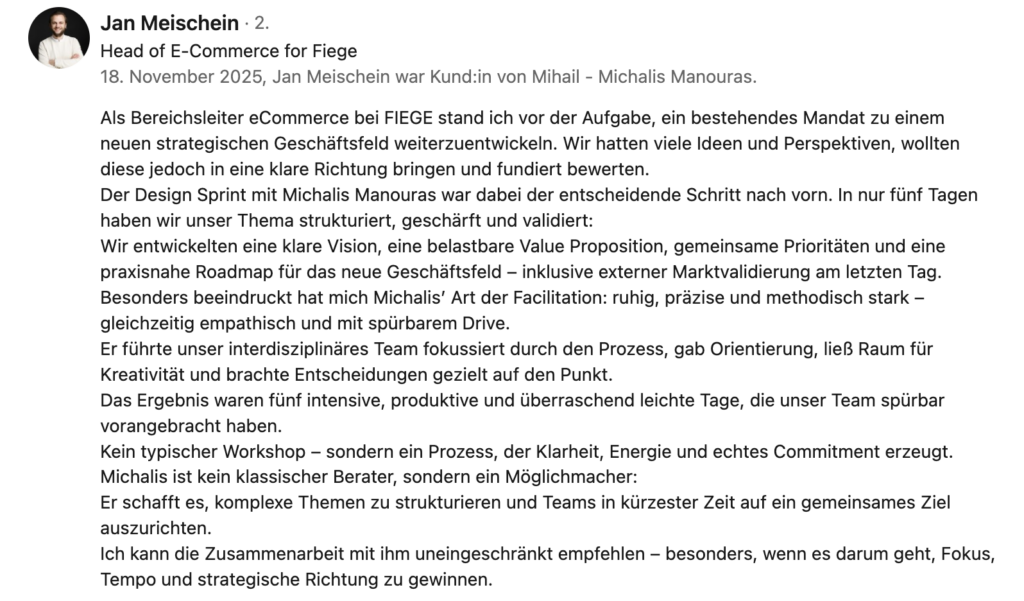 • „Business-Kontext, saubere Methodik und emotionale Intelligenz – das ist selten in dieser Kombination.“